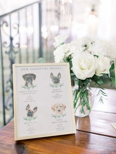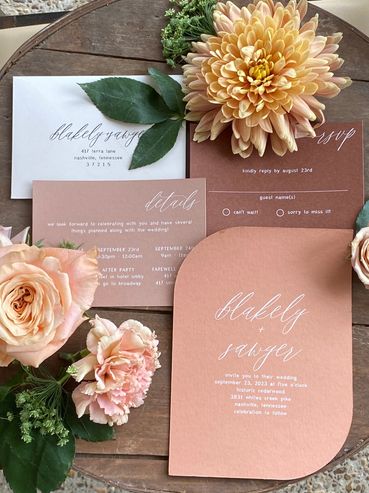 We offer custom designs for weddings, every day events and business events as well as logo and other marketing services. For weddings, we start with save the dates and continue a cohesive design from invitations to a wide variety of wedding weekend products including welcome cards/schedules, programs, seating charts, menus/place setting cards, table numbers, custom signage (bar, signature drinks, etc.) and so much more!